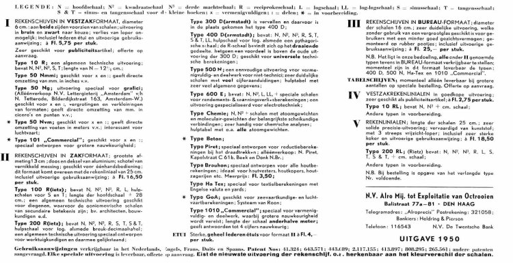In 2020 Dutch collector and expert on ALRO, Otto van Poelje, published: The ALRO Catalogue. In 200+ pages, after introducing the company and its manufacturing process, the hardback book meticulously catalogues with accompanying images every calculating disc, slide rule and slide chart ever made by ALRO. Watch the short introduction video and if interested, order a copy of the book..