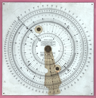 Appoullot T3 LogZ Spiral Slide Rule Made in France, Invented by Leon Appoullot in Paris, France. 14cm diameter- Reference patents FR547870 and GB180695 Front Scale: C, L, 3 revolution number scale, special root scales, tangent & sine scales. Scales wrap in a curious artistic way. Outer scales have accessory vernier scales for increased precision. Note: 3 revolution spiral number scale is about 79 cm long. Material: 20 cm diameter irregularly shaped enameled aluminum discs, with two transparent celluloid cursors. Fitted leather case. Archive - Photo courtesy of the Ed Chamberlain Collection