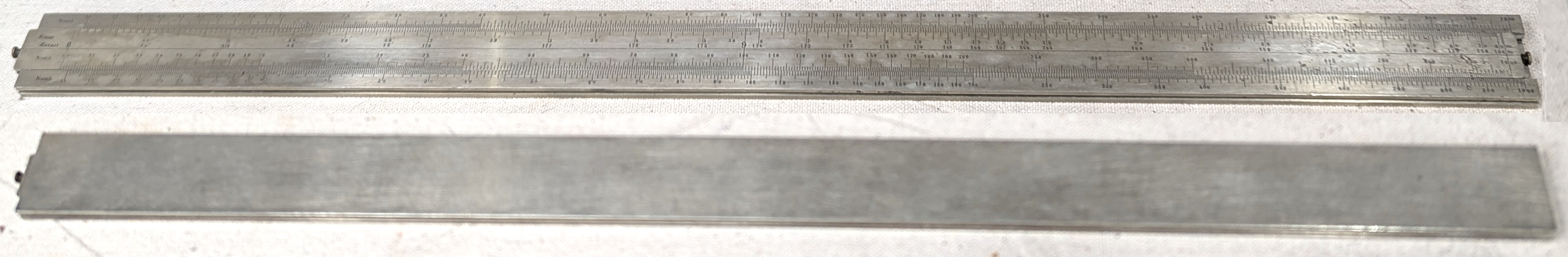 Maison Richer LeJard CIE Tachymetrical Slide Rule Made in France, Designed by Jean-Francois Richer 1743-1820 who was renowned for his divided scales. Maison Richer (translates to Richer House), Guyard & Canary (Paris)” Note: It is identical to one made by the Paris firm H. Morin, then at Rue Boursault nr. 3. It is possible that LeJard c1870 was the successor company to Maison Richer and then H. Morin c1882 obtained the Richer tooling to make the scales. Dimensions: 0.8 x 43.1 x 3.1 cm (5/16 x 16 15/16 x 1 1/4 in.) Material: German Silver stored in a mahagony clam shell box. Note: other variations were made from brass. Front Scale: Nomb [ Sinus Nomb ] Nomb Back of Slide: Nomb [ Tang, P.E. , Sin-2 , Sin-2 ] Nomb Note: Nomb is short for Nombre or Number. Michael Konshak Collection.