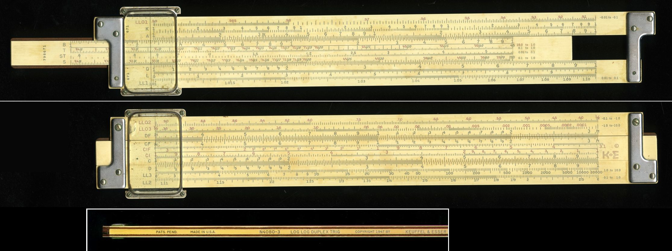 | K&E N4080-5 Log Log Duplex Trig - sn632018 Made in U.S.A. by Keuffel & Esser Co., New York Front Scale: LL01, K, A [ B, T, ST, S ] D, L, LL1 Back Scale: LL02, LL02, DF [ CF, CIF, CI, C ] D, LL3, LL2 |