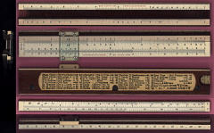 | K&E 4053-5 Lot 79 (1916-1921) Made in U.S.A. by Keuffel & Esser Co., New York Front Scale: 20inch // A [ B, CI, C ] D || K Back Slide: [ S, T, L ] Back: Equivalents and Abbreviations From U.S. Bureau of Standards Donated in part by Martha Prince, Tucson, Arizona, from the John Prince Collection. Martha is a donor of slide rules to ISRM and its Slide Rule Loaner Program. |