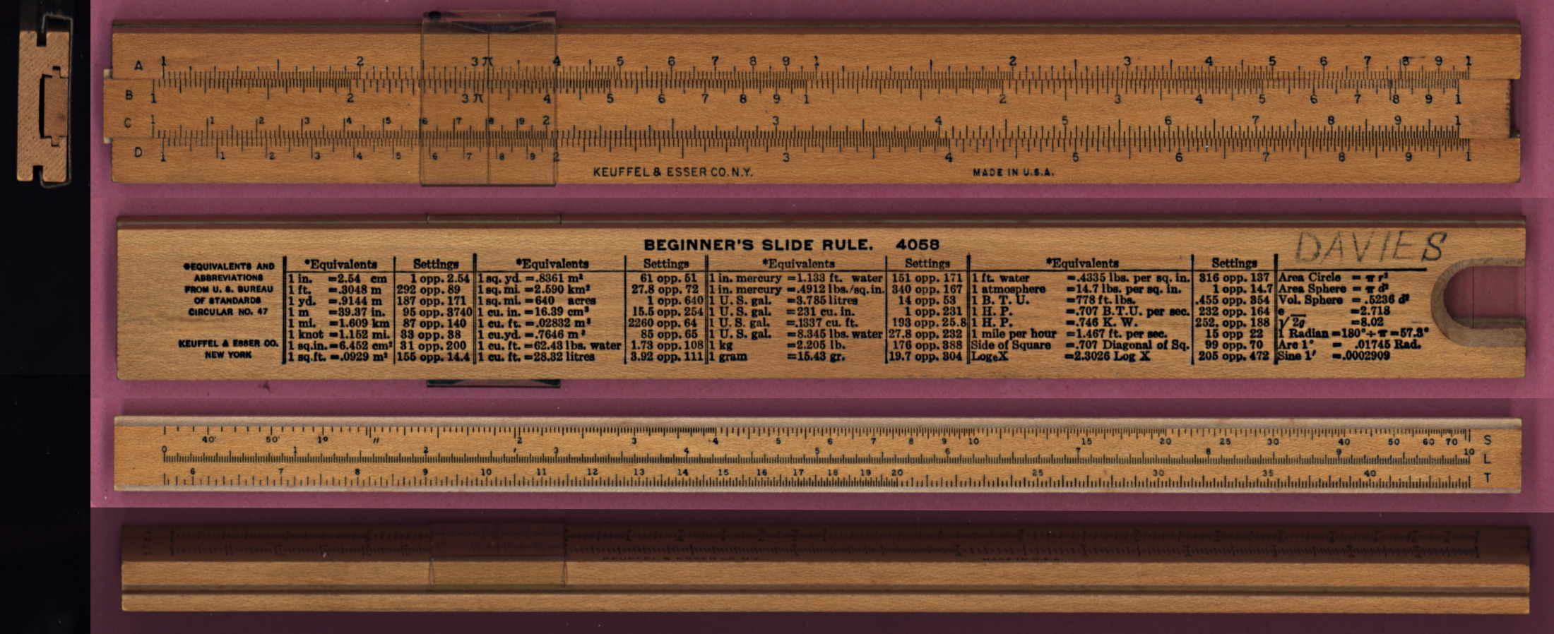 K&E 4031 5-inch Mannheim sn92226 1924 Version 1 Made in U.S.A. by Keuffel & Esser. All-Glass cursor(Indicator) Front Scale: 5inch // A [ B, C ] D || 12cm Back Scale: [ S, L, T ] Back: Early Equivalents label; Gift Of JoAnn Lynn of Washington D.C., Husband Joel L. Lynn's Collection W.L.E.Keuffel Patent drawingJune 5, 1900 US 0651142 (PDF)