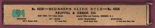 K&E 4181-3 Log Log Duplex Decitrig sn024987 Note: Image from sn 004408 Made in U.S.A. - all plastic (trade name 'Ivorite') stock, plastic cursor lens. Patents on slide: US 2,168,056;2,170,144;2,285,722 Front Scale (Artwork C:):> LL01, L, K, A [ B, T Cot, SRT, S Cos ] D, DI, LL1 Back Scale (Artwork A:::.): LL02, LL03, DF [ CF, CIF, CI, C ] D, LL3, LL2 Note: Green leather sleeve, no markings in Retail box Gift of Richard Vigil, Damascus, Maryland Box end |