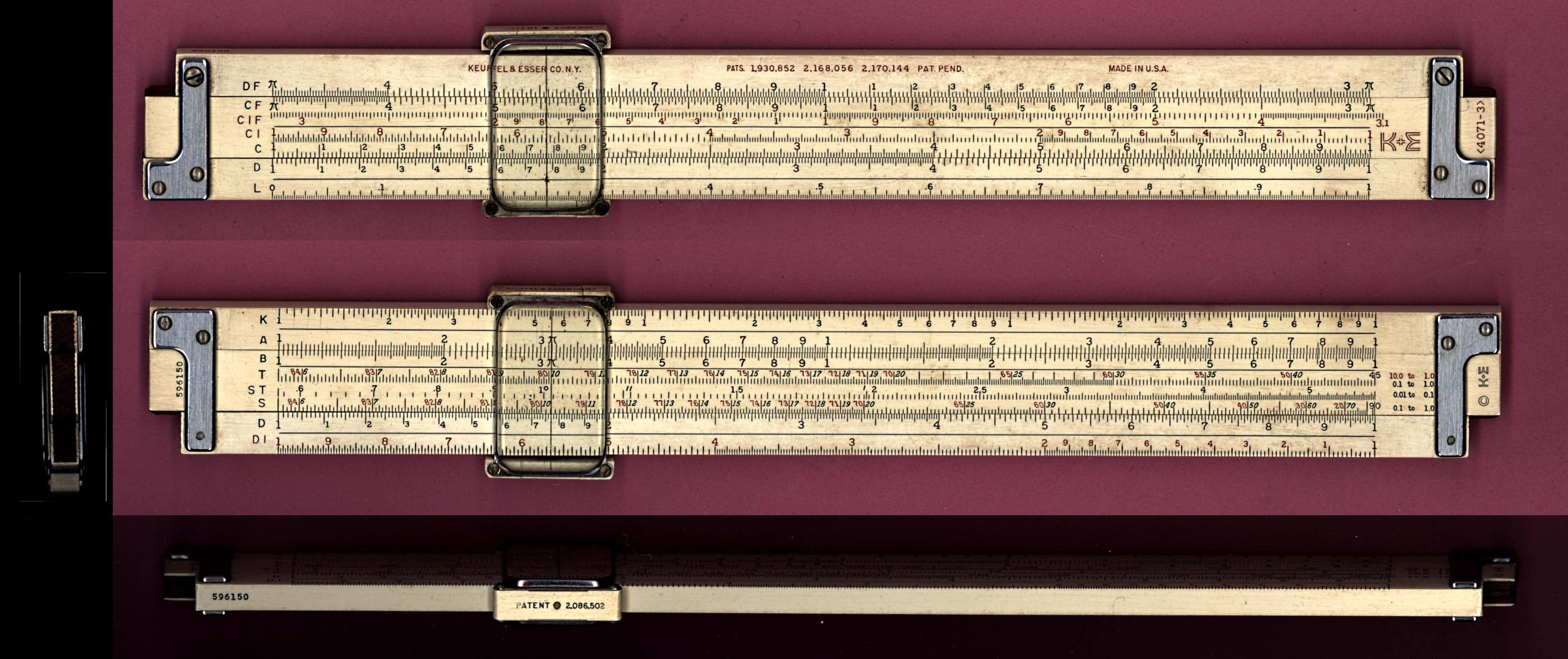 K&E 4092-5 20in Log Log Duplex sn468442 (1935) Made in U.S.A. by Keuffel & Esser, N.Y. Note: Scale set #2 (1925-1937) Patents marked on stock: June 5, '00, Dec. 22, '00, On Cursor: 2,086,502. Replaced with Patent Pending. Front Scale:LL0, A [ B, S, T, C ] LL3, LL2, LL1 Back Scale: K, DF [ CF, CIF, CI, C ] D, L Note(from Clark McCoy):The LL0 scale has an "e" at the beginning and end of the scale. It should be "e to the -1". This error was corrected by K&E between serial numbers 455535 and 460179. This correction appears to be coincident with the introduction of the New Improved Cursor. This serial number dating places this change at probably early 1935. |