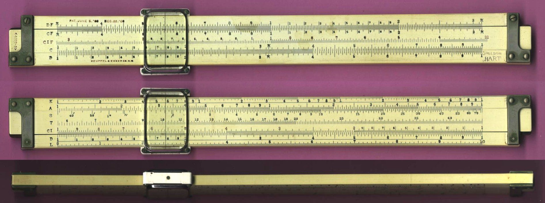 K&E 4035 Mannheim Finely Divided Lot 453 Made in U.S.A. - circa 1915 Note: Patent reference on stock: Pat.June 5, 1900 Frameless glass cursor Front Scale: 8inch // A [ B, C ] D || 21.2cm Back Scale: [ S, L, T ] Back: Equivalents ![]() |