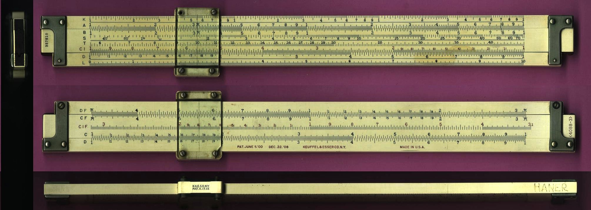 K&E 4035 Mannheim Finely Lot 2 Made in U.S.A. - circa 1915 Note: Laminated well. with Patent reference: Pat.June 5, 1900 Frameless glass cursor Front Scale: 8inch // A [ B, C ] D || 21.2cm Back Scale: [ S, L, T ] Back: Equivalents Gift of Ed Millis, Dallas, Texas.