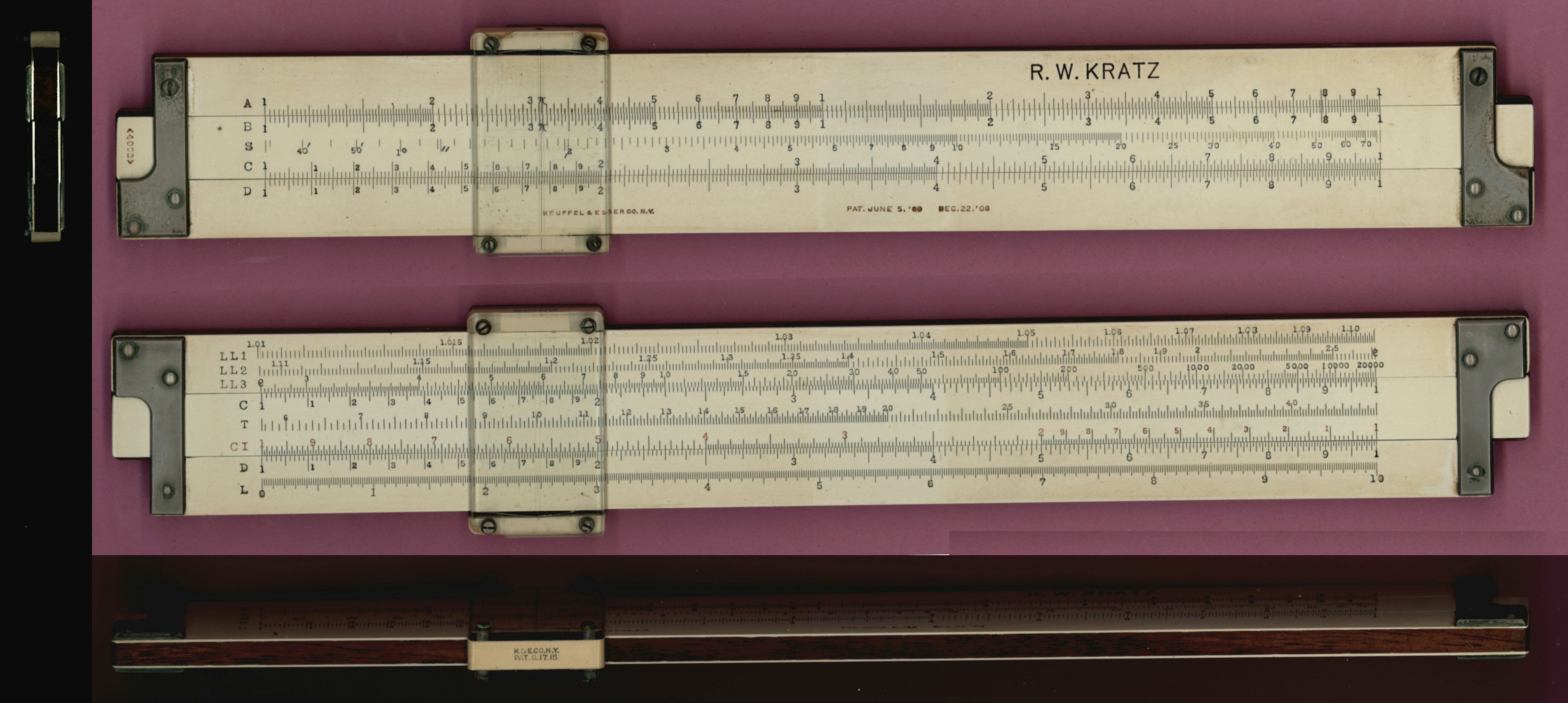 K&E 4041 Mannheim Lot#211 c1901 Made in U.S.A. by Keuffel & Esser Co., New York Front Scale (no scale labels) 10 Inch // A [ B, C ] D || 27 Cm Back Scale: [ S, L, T ] Back: Equivalents Gift Of Nick Krantz, Pasadena, California Note: The Cursor shown, which is missing the glass lens, is actually for an early Faber-Castell model. It was put on by the ISRM curator in 2015 to make the slide rule look complete.It has since been removed from this specimen for historical accuracy we're still in the hunt for a replacement.. |