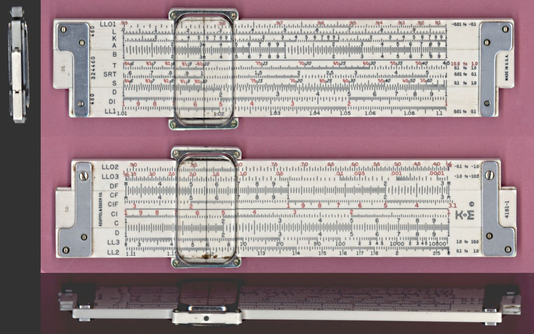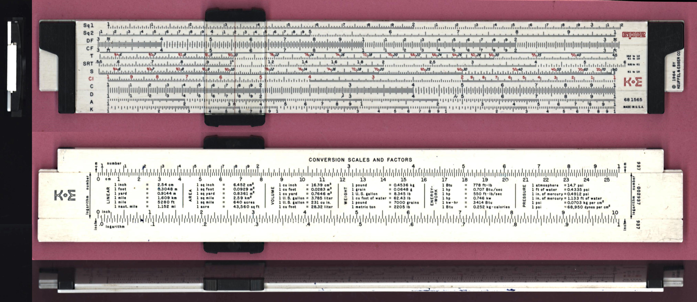 K&E 68-1608 Modern Polyphase sn510171 c1975 Made in U.S.A. by Keuffel & Esser Co., New York Front Scale: 20inch // A [ B, CI, C ] D, K || 50cm Back Slide: [ S, L, T ] Back: Equivalents and Abbreviations U.S. Bureau of Standards Circular No.47 Gifted by JoAnn Lynn of Washington D.C.in memory of husband Joel L. Lynn (1943-2022)