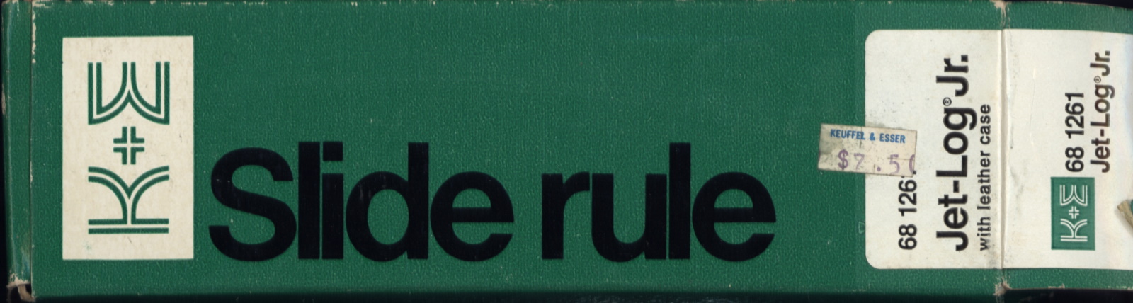 K&E 68-1261 Jetlog Jr. Log Log Duplex Decitrig sn137788 c1969 Made in U.S.A.- Note: No model number on stock. like the early 4181-1 Front Scale: LL01, L, K, A [ B, T Cot, SRT, S Cos ] D, DI, L1 Back Scale: LL02, LL03, DF [ CF, CIF, CI, C ] D, LL3, LL2 Gift of JoAnn Lynn of Washington, D.C. Joel L. Lynn Collection |