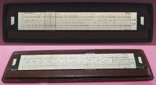 K&E N4081-5 Log Log Duplex DeciTrig - sn766300 Made in U.S.A. by Keuffel & Esser Co., New York Front Scale: LL01, K, A [ B, T Cot, ST, S Cos ] D, L, LL1 Back Scale: LL02, LL03, DF [ CF, CIF, CI, C ] D, LL3, LL2 Note 1: ST scale was used in 1954, in 1955 it was labeled SRT Note laminated mahogony and celluloid edges, making this one of the most attractive and warm-feeling slide rules made by K&E. Donated by his wife Jeannette Lyon, Myrtle Beach, Florida, in memory of her husband, Bud. Jeanette's slide rule is in the Pickett gallery As a teenager Bud had read Robert A. Heinlein's novel Have Space Suit Will Travel (1958) which inspired him to buy this particular slide rule model, uncharacteristic for a teenager. A character in Heinlein's novel states: "Dad says that anyone who can't use a slide rule is a cultural illiterate and should not be allowed to vote. Mine is a beauty - a K&E 20-inch Log-log Duplex Decitrig" . |