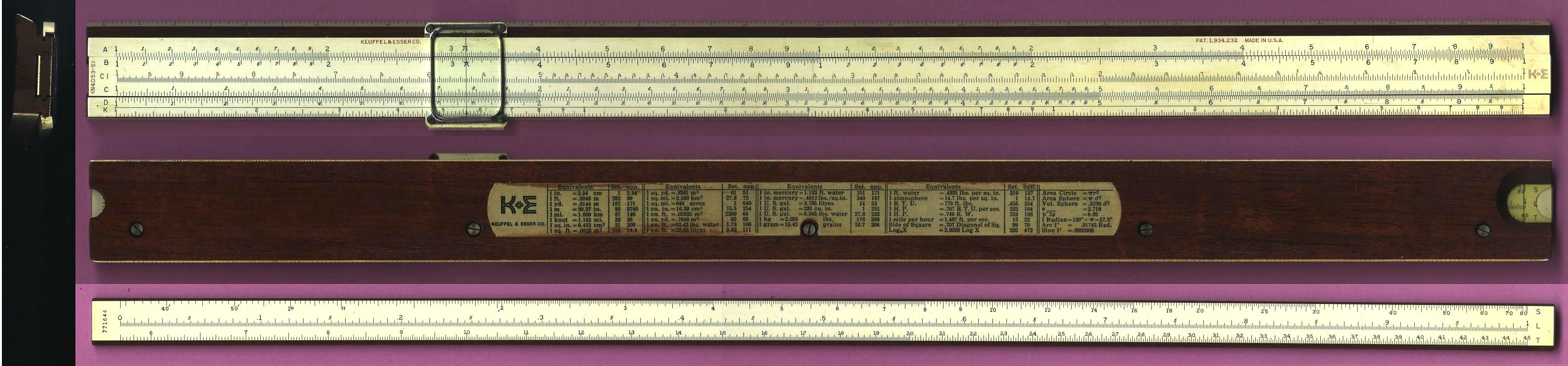 K&E 4051 Lot 173 (1915) Made in U.S.A. by Keuffel & Esser Co., New York Note: metal cursor blocks were only used in 1915 Front Scale: 20inch // A [ B, C ] D || 50cm Metric Rule Back Slide: [ S, L, T ] Back: Equivalents and Abbreviations Gifted by Joseph J. Graf III, grandson of original owner James J. Graf, Sr.