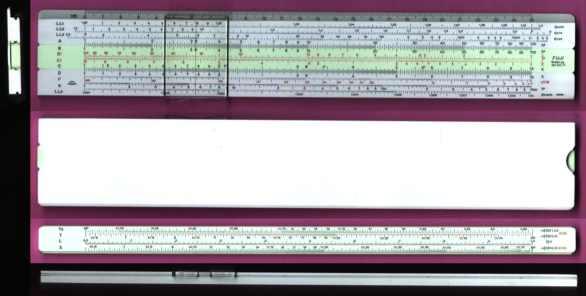 Fuji 552P Duplex Log/Log Made in Japan - 23 scales Front Scale: LL-0, K, A [ B, T, S, C ] D, P, L, LL0 Back Scale: LL-1, LL-2, LL-3, DF [ CF, CIF, CI, C ] D, LL3, LL2, LL1 |