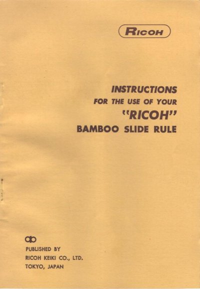 REF - Scanned by Bill Robinson Ricoh - Bamboo Slide Rules - Model 159 Ricoh Bamboo Slide rule Inst Ricoh Keiki Co., Ltd. Tokyo, Japan 24 pages |