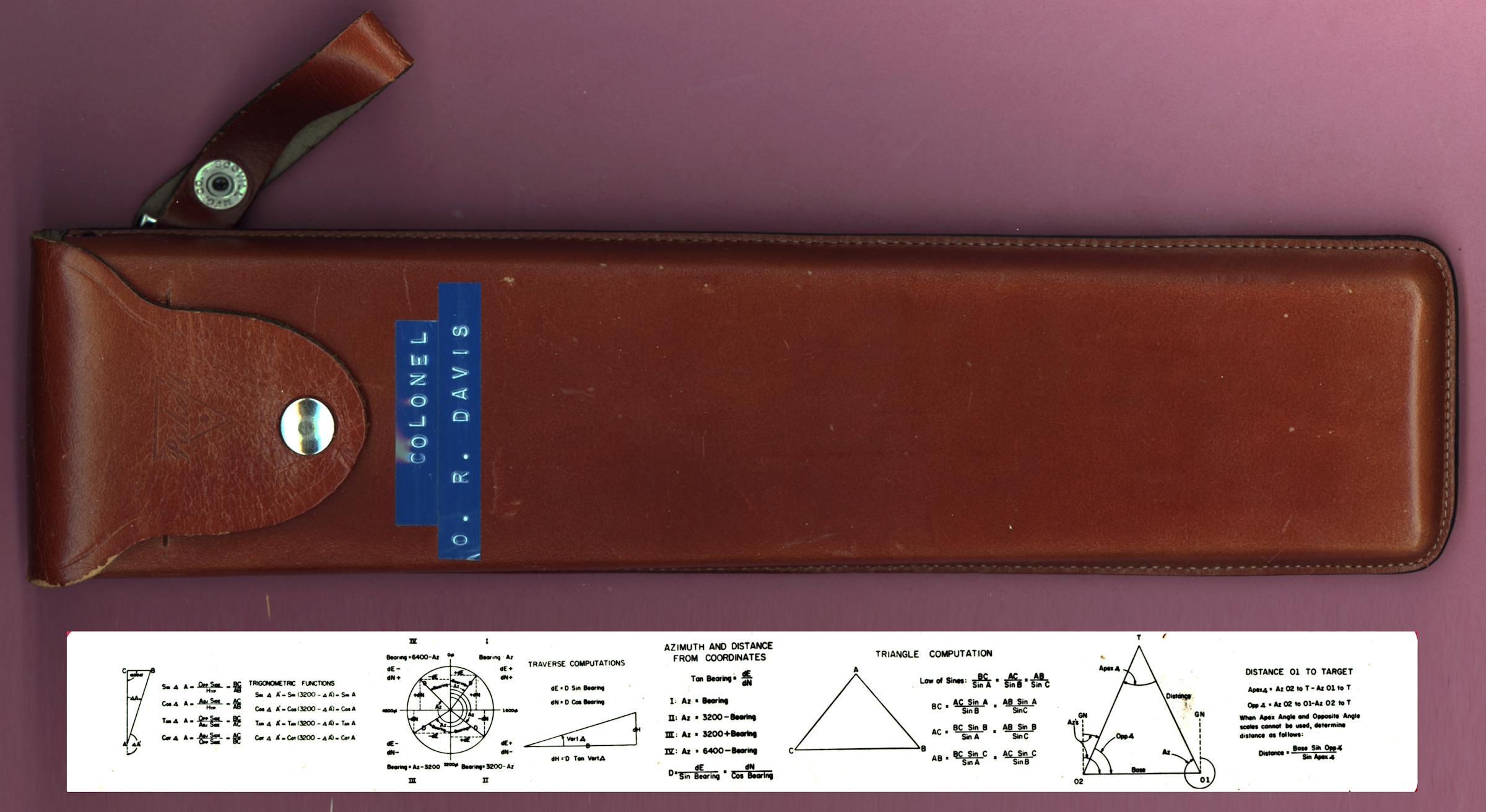 Pickett 1010-ES Duplex - Transitional Model Made in USA by Pickett and Eckel in Alhambra by Cal-Pan Co. using Pickette artwork. This is an aluminum stock transitional model which coincides with design changes to the slide rules, as well as the leather sleeve, with the move from Chicago, Illinois to Alhambra, California. It is the first time the -ES or -T appears as part of the model number artwork. Note:Round black logo. First appearance of Aluminum stock with tension spring on upper stock (to keep slide falling out). Rounded braces as was used with magnesium stocks, extended nylon cursor bars, grooved flat lens. All part of a cost reduction. The radii on the upper and lower stock corners were soon discontinued in favor of square corners, another cost reduction in machining time. Front Scale (Artwork #74): K, A [ B, ST, T Cot, S Cos, C ] D, DI Back Scale (Artwork #271): DF [ CF, CIF, CI, C ] D, L Note: The sleeve shown is a very rare transitional design, and is the first attempt at Pickett making leather sleeves, after the tacky rubber type which was introduced with other magnesium models in 1948. The rubber model retained moisture and added to the corrosion of the magnesium stocks. Notice the 'D' ring used for leather belt loops, to compete with K&E and Post sleeves. In 1953-54 John Pickett formed Pacific Leather Works to make slide rule cases which had plastic inner liners. Gift of the Bill Wehrend Collection, Palo Alto, California. |